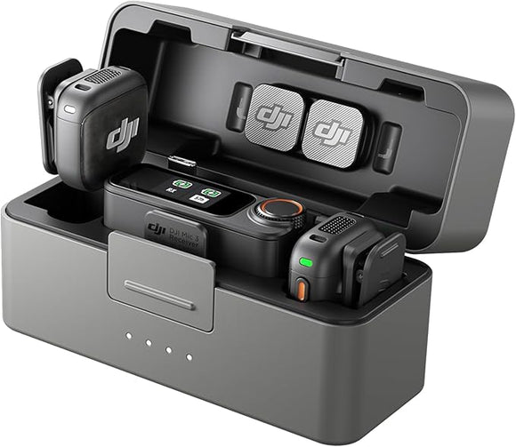 El DJI Mic 3 USB-C es un sistema inalámbrico profesional con 1 receptor y 2 transmisores, diseñado para entrevistas, podcasts y producción de contenido avanzado. Ofrece audio de alta fidelidad, reducción de ruido eficiente y hasta 7 horas de autonomía por transmisor.